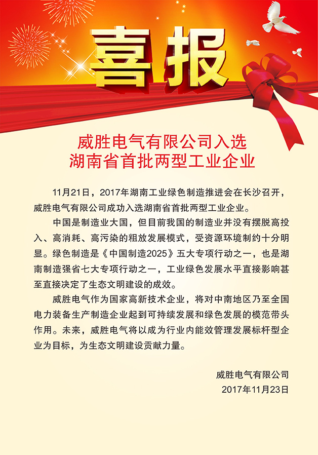 11月21日,2017年湖南工業(yè)綠色制造推進(jìn)會(huì)在長(zhǎng)沙召開(kāi),威勝電氣有限公司成功入選湖南省首批兩型工業(yè)企業(yè)。