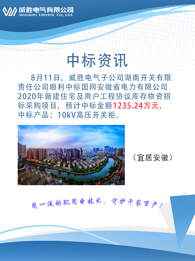 8月11日,威勝電氣子公司湖南開關(guān)有限責(zé)任公司順利中標(biāo)國網(wǎng)安徽省電力有限公司2020年新建住宅及用戶工程協(xié)議庫存物資招標(biāo)采購項目,預(yù)計中標(biāo)金額1235.24萬元,中標(biāo)產(chǎn)品:10kV高壓開關(guān)柜。