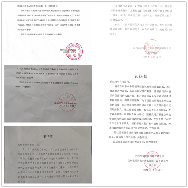 2022年1-3月,威勝電氣收到湖南星電集團、盛隆電力、湖南名正電力、桃源供電公司、贛州市政公用投資控股集團、重慶恩捷新材料、中藍長工比亞迪項目等電網重點工程、省市重點項目客戶的十余份表揚信。感謝信中既有強調我司項目人員超強的專業技術能力,確保了項目在各種客觀因素限制下,依然確保了項目提前驗收通電;也有高度肯定我司項目人員工作態度積極,具有超強的責任心和服務意識和態度,與調試班組同進同退,為項目的順利進行起到了很好的橋梁和示范作用。
