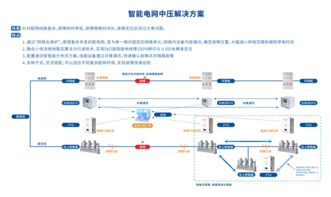 面對(duì)中壓配電網(wǎng)結(jié)構(gòu)復(fù)雜、故障處置效率低的難題,我公司全新推出的一體化智能自愈方案。系統(tǒng)采用“智能分區(qū)自治”理念,將復(fù)雜線路劃分為多個(gè)協(xié)同運(yùn)行的智能單元,依托智能算法與高效通信,實(shí)現(xiàn)秒級(jí)故障定位、隔離和無感恢復(fù)供電,大幅提升供電可靠性。